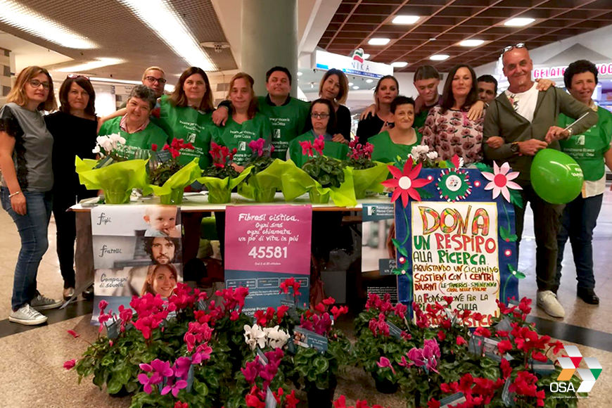 In occasione della XVI campagna nazionale per la ricerca sulla Fibrosi cistica (6 ottobre 2018), i ragazzi e gli operatori dei tre Centri diurni di Latina gestiti da OSA, ‘Le Tamerici’, ‘Salvatore Minenna’ e ‘Casal delle Palme’, hanno contribuito alla vendita dei ciclamini presso il Centro Commerciale Latinafiori.